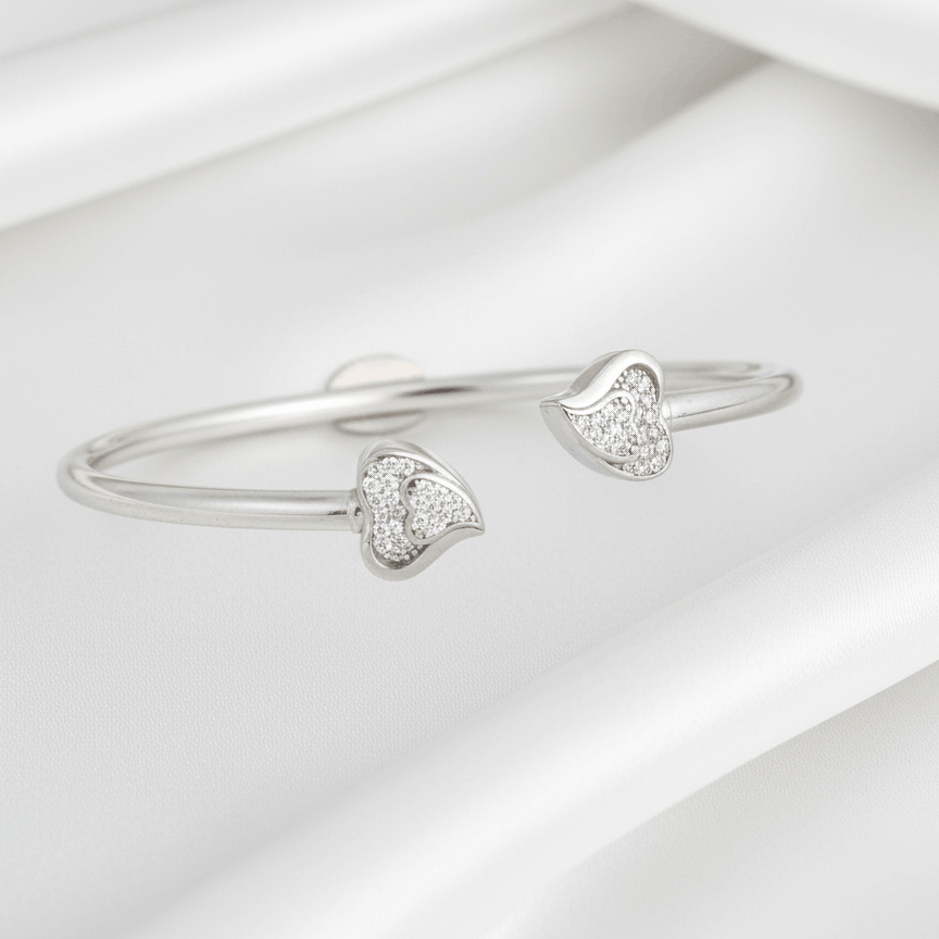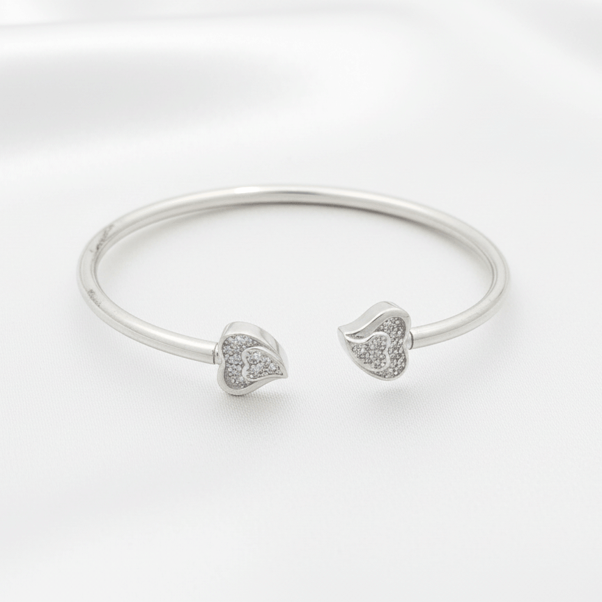 This elegant silver bracelet is made from certified 925 sterling silver, ensuring purity, durability, and long-lasting shine. The open adjustable design makes it comfortable to wear and suitable for most wrist sizes. Its sleek polished finish enhances the brilliance of the heart-shaped stone detailing, making it perfect for both everyday wear and special occasions.
