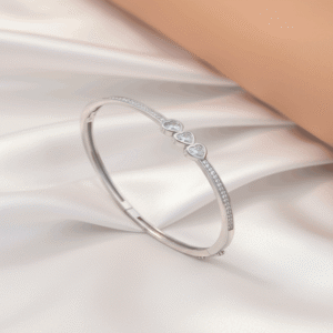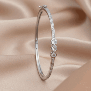Add grace and elegance to your jewellery collection with this stunning 925 Sterling Silver Heart Stone Kada for Women from Binduxi Jewellers. Crafted from pure 925 sterling silver, this designer bracelet features three beautifully set heart-shaped stones aligned vertically, symbolizing love and sophistication.