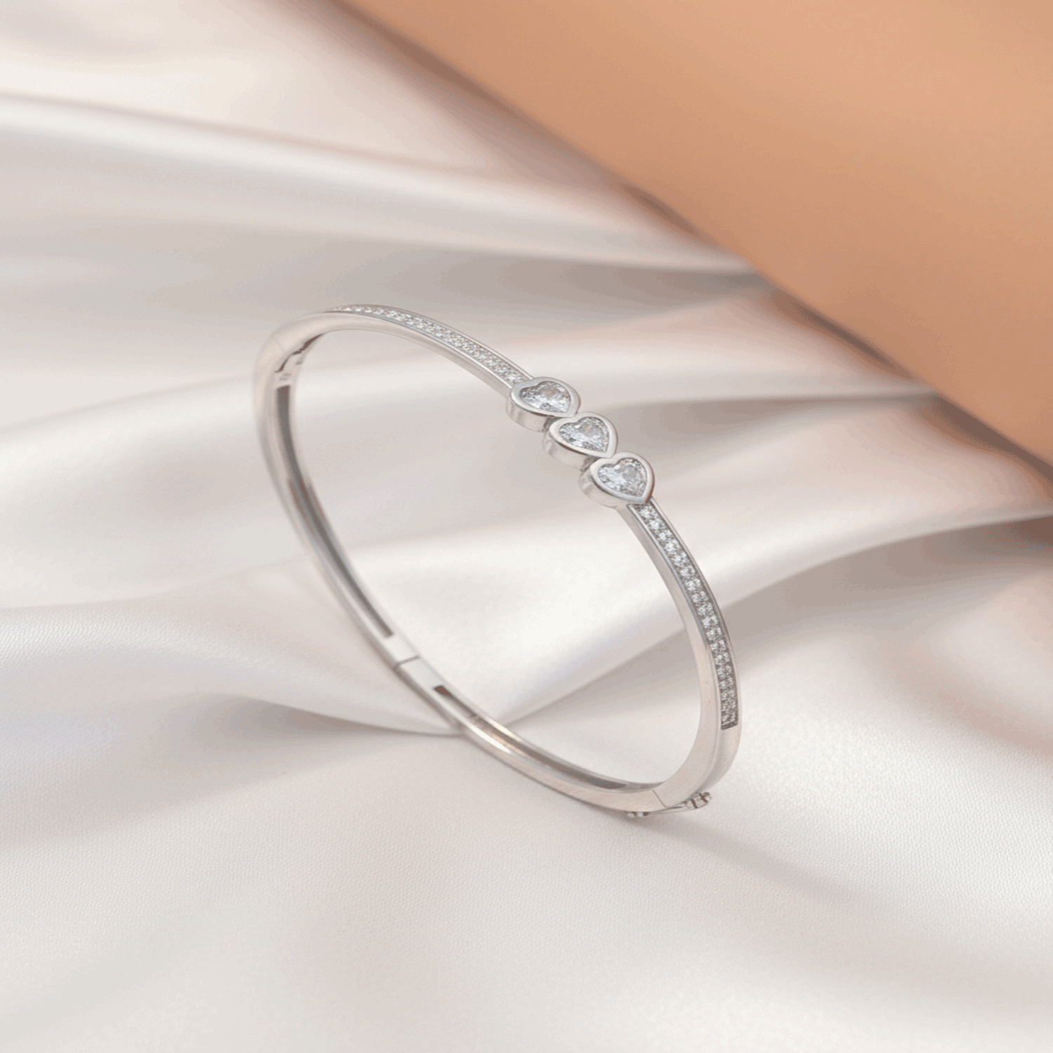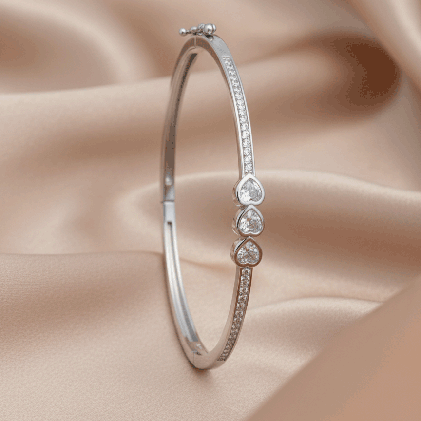 Premium 925 Sterling Silver Heart Stone Kada for Women featuring sparkling CZ stones and elegant slim design.